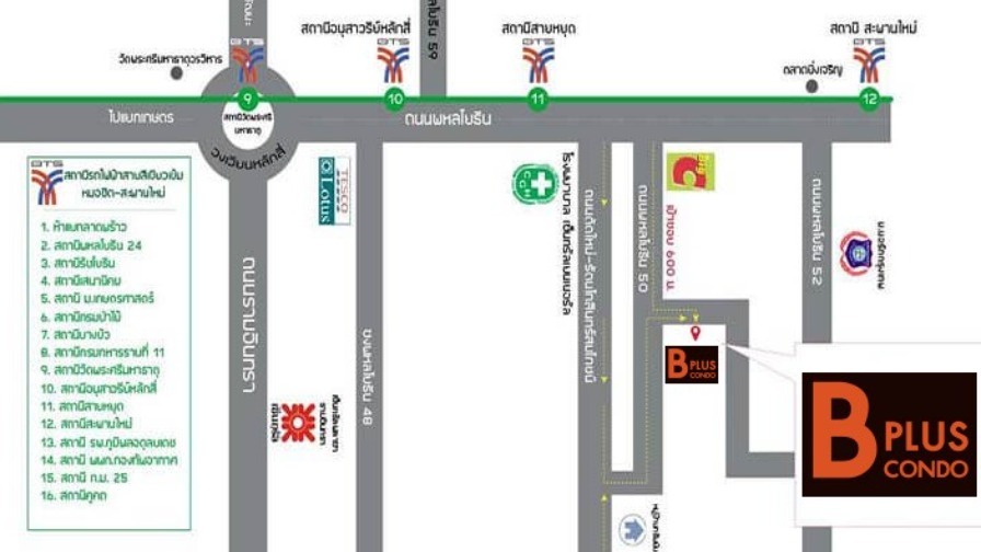 ทำเล โครงการ บีพลัส คอนโด (B Plus Condo) พหลโยธิน 50 ที่ตั้ง ซอยพหลโยธิน 50 แยก 1 (ซอยร่วมมิตรพัฒนา) แขวงคลองถนน เขตสายไหม กรุงเทพฯ การเดินทางด้วยรถไฟฟ้า เพียง 750 เมตร ถึง BTS สถานีสายหยุด (สายสีเขียวเข้ม) นั่งต่อเดียวเข้าสยาม/อโศก